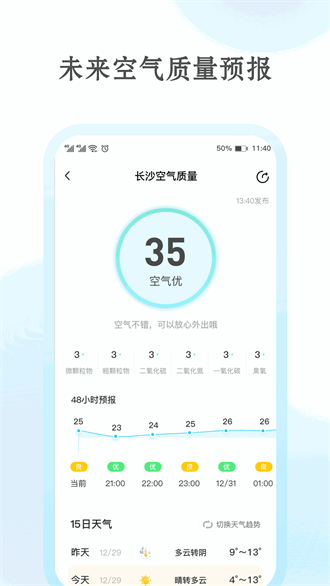 2、帮助用户了解当前空气质量状况,并提供空气指数的实时更新,可以查看空气质量状况和紫外线;