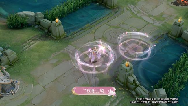 释放出二技能,霜雾与花瓣环绕在一起,在地面上凝聚,形成层层盛开的芙蓉花阵,整体为粉色的花瓣特效,嫦娥脚下也是有着花瓣的形状。